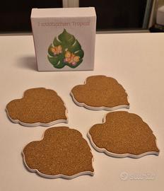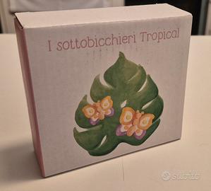 Set 4 sottobicchieri originali Thun in ceramica dipinta e sughero, serie Tropical 2018, a forma di foglia con farfalle colorate, dimensioni in foto, mai utilizzati, ancora nella scatola. €12 + eventuali ss. Possibile consegna a mano a Milano, Monza, Lecco e, saltuariamente, Torino.
