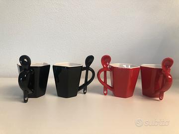 Set 4 tazzine in ceramica con cucchiaini 2 colore rosso e 2 colore nero Prodotto avon Usate pochissime volte e in buono stato