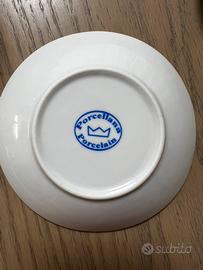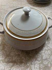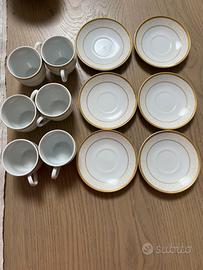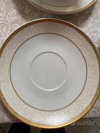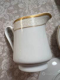 Bellissimo set vintage composto da 48 pezzi in porcellana bianca con doppio rigo oro. Composto da 6 piatti piani , 6 piatti fondi , 6 piatti dolce, 6 tazzine da tè con piattino, 6 tazzine da caffè con piattino , zuccheriera con coperchio , teiera con cooerchio , porta biscotti con coperchio,lattiera. Miniscola sbeccatura su una tazzina da caffè. Piccola sbavatura di fabbrica su un piattino dolce. Vista la delicatezza del servizio, solo consegna a mano .