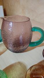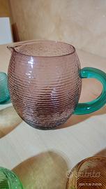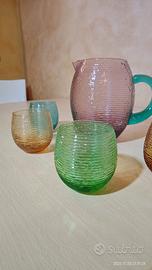 Set composto da caraffa + 5 bicchieri colorati. In vetro soffiato, eseguiti a mano, marchio IVV Industria Vetraria Valdarnese, lavabili in lavastoviglie. La superficie esterna presenta una rigatura che, oltre ad un effetto estetico, li rende antiscivolo. Usati un paio di volte ma in ottimo stato. Praticamente pari al nuovo. Senza imperfezioni.