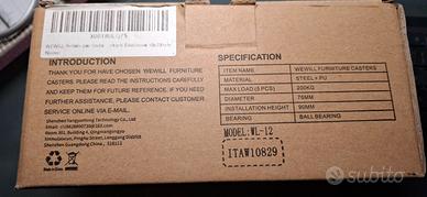 Marca WeWill set di 5 pezzi per sedie e mobili, non fanno rumore perche' le ruote sono rivestite di gomma morbida. Nuove mai usate con scatolo originale. Materiale: Acciaio + PU Carico Massimo: 200KG Diametro ruota: 76mm Misura: 10x22mm