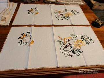 tovaglia vintage natalizia ricamata a mano in puro cotone, con fili dorati nuova mai usata set 5 pezzi