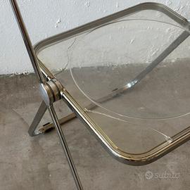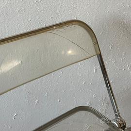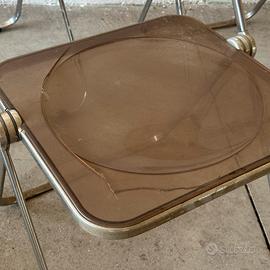Le sedie presentano struttura in acciaio cromato e seduta e schienale in plexiglass in diverse tonalità: trasparente, ambra e fumé. 1 sedia e’ in condizioni vintage con segni di usura del tempo e necessita di lucidatura sul telaio e sulle plastiche, 4 hanno plastiche rotte e sono da considerare da sistemare - ottime per ricambi e/o da ripristinare