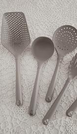 Set 5 utensili mestolame Abert Cucinart colore tortora in nylon, resistenza fino a 210°C. Nuovissimi, perfetti per la preparazione e per il servizio in tavola.