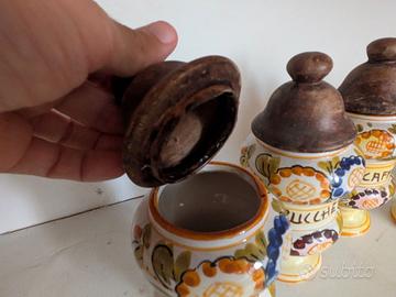 Vendo set composto da 5 vasetti portaspezie in ceramica smaltata ideali per contenere sale, pepe, zucchero o altre spezie.