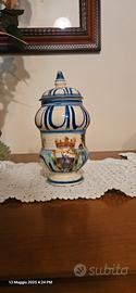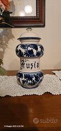 Vendo elegante set di 5 vasi da farmacia in ceramica smaltata e dipinta a mano, perfetti per arredamenti in stile classico, erboristeria vintage o come elementi decorativi da collezione.