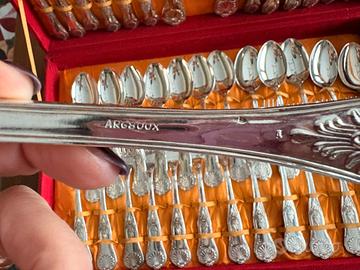 Posate da 12 persone piu 3 da portata. Placcate argento. Mai usate. Nella scatola originale. Faccio presente che l scatola nella parte sopra presenta delle macchie in quanto tenuta sempre al chiuso in un armadio.