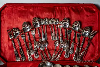 Set di posate vintage del secolo scorso completo in elegante cofanetto originale rivestito in raso rosso acceso, perfettamente sagomato per contenere ogni elemento in modo ordinato e protetto.
