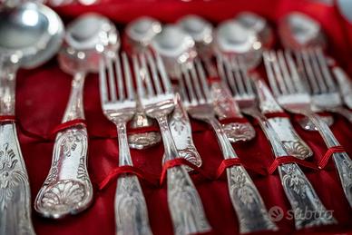 Le posate sono punzonate ARG 800, con decorazioni classiche ed eleganti che donano un tocco senza tempo alla tavola. Il design è armonioso e ricercato, ideale sia per l’uso quotidiano che per occasioni speciali, cene formali o mise en place dallo stile Condizioni: mai usato con ottime condizioni generali, solo lievi segni del tempo coerenti con l’età del set (eventuali leggere ossidazioni o micrograffi da lucidare).