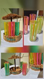 Set di 6 bicchieri con un design vivace e colorato, perfetti per cocktail e bevande estive. Il supporto in bambù a forma di chiringuito spagnolo aggiunge un tocco esotico.