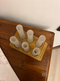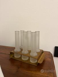 Originalissimo set composto da 6 bicchierini shot in vetro satinato con design tubolare, accompagnati da un vassoio dorato in metallo con maniglie laterali.