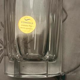 Vendo elegante set di 6 bicchieri in cristallo al piombo (PbO) marchiati Comolla, caratterizzati da lavorazione sfaccettata e raffinato bordo dorato con decoro inciso.