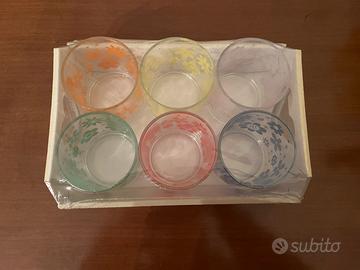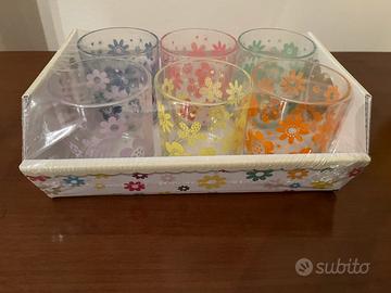 Set di 6 bicchieri colorati con decorazioni floreali, nuovi e mai utilizzati.