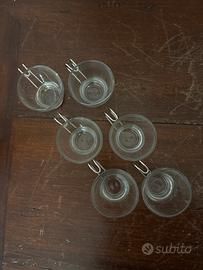 Splendido set di 6 bicchierini in vetro trasparente caratterizzati da un supporto metallico removibile che funge da manico e base. Un classico del design vintage, perfetto per servire caffè espresso, amari o liquori dopo cena con un tocco di eleganza retrò.