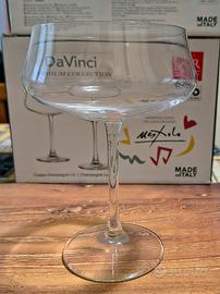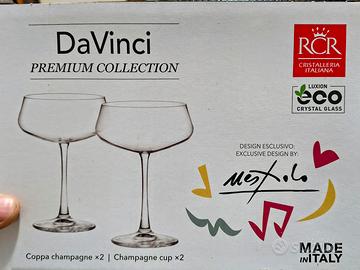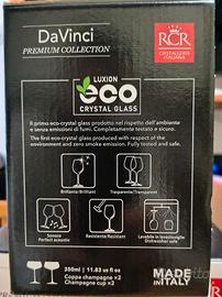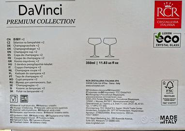 Elegante set di 6 calici flûte da 350ml per champagne RCR Da Vinci Premium Collection, disegnati da Ugo Nespolo. Un calice è alto 16 cm e largo 11 cm. Made in Italy. Realizzati in cristallo di alta qualità. Logo RCR appena visibile alla base. Sono brillanti, resistenti e lavabili in lavastoviglie. La forma studiata ad arte dona un'eccellente sonorità acustica per il brindisi. Inutilizzati, praticamente nuovi, in confezioni originali.