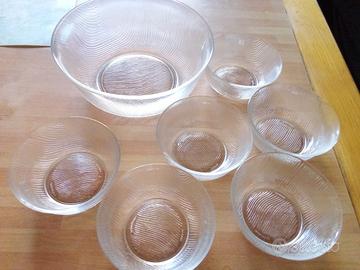 Elegante set composto da un piatto e sei ciotole in vetro trasparente, perfetti per servire macedonie o dessert.