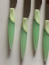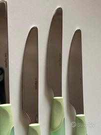 Elegante set di sei coltelli da tavola Guy Degrenne. - Manici in plastica traslucida verde. - Lame in metallo seghettate.