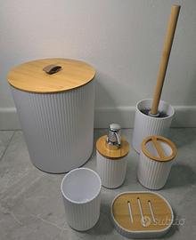 SPEDIZIONE IN TUTTA ITALIA 🇮🇹 NUOVO set di 6 pezzi accessori bagno colore bianco e dettagli legno.