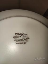 Set di 6 piatti piani vintage modello Harmonia, diametro 24 cm, con bordi sottili e decorazioni minimali colorate.