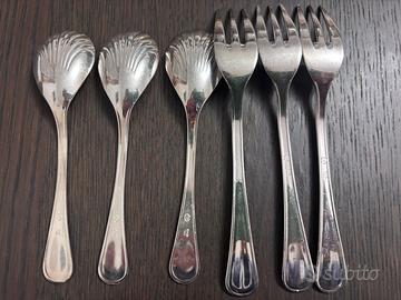 Elegante set composto da 3 cucchiaini e 3 forchettine da dessert in E.P.N.S. (silver plated), con raffinato decoro a conchiglia.