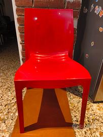 Set completo composto da 6 sedie in polipropilene Highmopp con finitura rosso lucido. Il design, moderno e ricercato, richiama le linee di modelli iconici come la Skin di Calligaris o la Gruvyer, caratterizzandosi per le gambe a sezione triangolare e lo schienale ergonomico traforato.