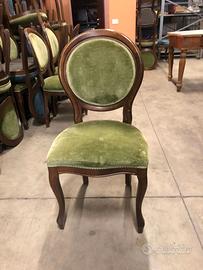 Seduta e schienale imbottiti e rivestiti in velluto verde o blu, tonalità raffinata ideale per sala da pranzo, ristorante, bistrot o ambiente classico/contemporaneo.