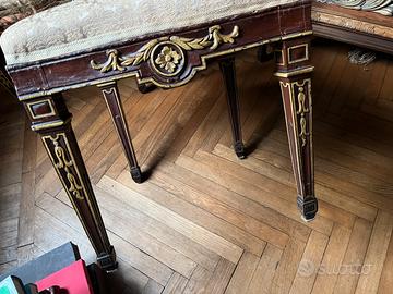Elegante set di sedie stile neoclassico (Luigi XVI), due con tappezzeria rifatta e in ordine, le altre 4 con tappezzeria da restaurare. La struttura in legno presenta una raffinata finitura scura con profili e intagli dorati a contrasto.