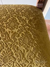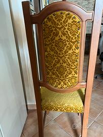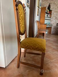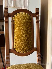 Vendo bellissimo set di 6 sedie vintage dal design classico ed elegante, ideali per dare un tocco di personalità al tuo soggiorno o alla tua sala da pranzo. Le sedie presentano una robusta struttura in legno con rifiniture intagliate e uno schienale alto e decorativo, tipico dello stile retrò degli anni '30-'50. La seduta e la parte centrale dello schienale sono finemente imbottite e rivestite in tessuto damascato/velluto di un vivace colore giallo ocra/oro, che dona molta luce all'ambiente. Caratteristiche principali: Quantità: 6 sedie disponibili. Materiali: Legno massiccio e rivestimento in tessuto con trama a rilievo. Dettagli estetici: Schienale con intagli laterali, gambe lavorate e seduta rifinita con cura. Dimensioni: Altezza 115 cm | Seduta 45x45 cm. Stato: Le sedie sono ben conservate e la struttura è solida.