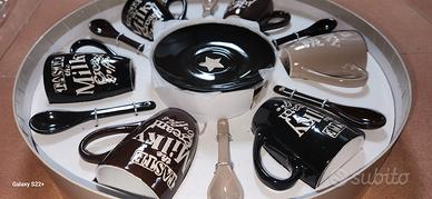 Vendo Set 6 tazze da caffe in ceramica compreso di cucchiaini e piattini. Il tutto è nuovo nella scatola originale Prezzo 30 euro No spedizione