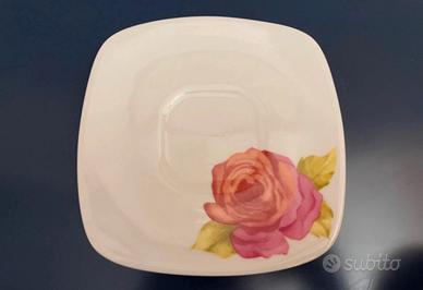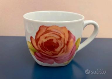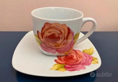 Elegante servizio composto da 6 tazze da tè con piattino coordinato, in porcellana fine decorata con rose romantiche.