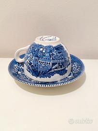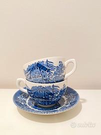 Vendo splendido set da 6 Tazze da Tè con Piattino “Avon Cottage”, prodotto dalla storica manifattura inglese Enoch Wedgwood. Il set appartiene alla celebre collezione “Avon Cottage”, un classico del design Transferware blu e bianco. La decorazione ritrae una tipica atmosfera bucolica inglese con cottage, ruscelli e finiture floreali. Produzione: Made in England (Tunstall, Staffordshire) Periodo: anni ‘60/‘70 Materiale: Fine English Ironstone Non presenta sbeccature evidenti, sono presenti delle crepe del rivestimento vetrificato. Verrà imballato in maniera adeguata per la spedizione “a prova di corriere”