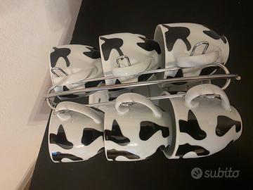 Elegante set di 6 tazzine da caffè in porcellana con un simpatico motivo a mucca. Perfette per aggiungere un tocco di allegria alla tua pausa caffè. - Design unico a macchie nere su sfondo bianco. - Supporto in metallo per riporle comodamente.