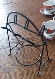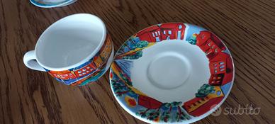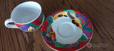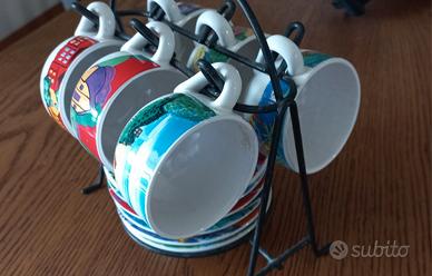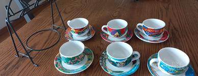 set di 6 tazzine dipinte a mano, ognuna con diverso soggetto, oltre ai relativi piattini con medesima fantasia, nonché ad un apposito espositore in metallo. La decorazione manuale prima della cottura in forno appare evidente anche dalle tipiche sbavature di colore, che ne sottolineano la piacevolezza. Le tazzine hanno un diametro di quasi cm. 7,5 e sono alte cm. 5, mentre i piattini hanno un diametro di cm. 11,5. possibile consegna a mano su Roma