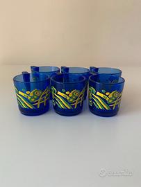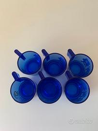 Elegante set composto da 6 tazzine da caffè in vetro blu, impreziosite da raffinate decorazioni gialle e verdi. Ideali per servire il caffè con stile o come complemento decorativo per la cucina.