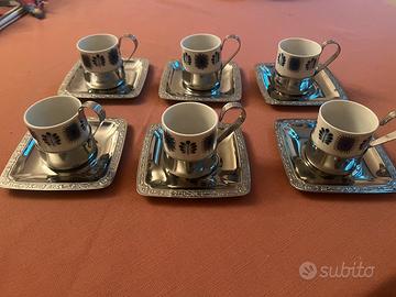Set 6 tazzine in cermamica con fondo e piattini in metallo color aegento