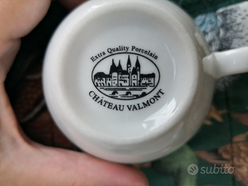 Introvabile servizio da the / cappuccino per 6 persone, comprensivo di 6 tazze tutte diverse e 6 piattini, ciascuno con la scritta multicolor "country line".