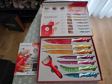 Il set include 7 coltelli di diverse dimensioni, adatti a tutte le esigenze in cucina, e un pelapatate in ceramica in omaggio.