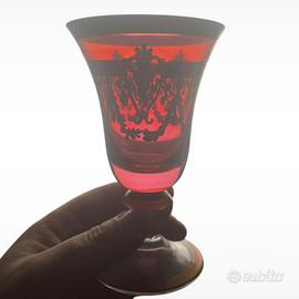 I bicchieri presentano una lavorazione molto decorativa con fregi dorati in stile barocco/neoclassico, impreziositi da vetri in diverse tonalità (trasparente, ambrato e rosso rubino) che creano un effetto visivo molto scenografico, perfetto sia per l’uso che come elemento d’arredo.