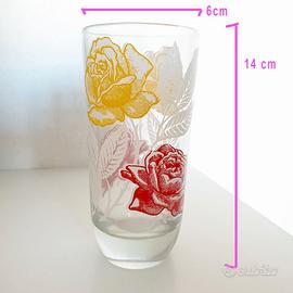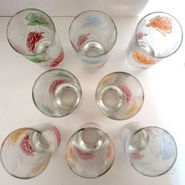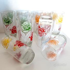 Servizio di 8 bicchieri alti in vetro MCM long drink highball con disegno floreale anni '50 prodotti negli Stati Uniti. Fiori rose di colore rosso verde giallo blu arancio. Colori ancora vibranti. Misura perfetta per acqua, vino, bibite, frullati, dessert. Altezza 14 cm, diametro 6 cm. In perfette condizioni. RARI da reperire Scambio a mano a Roma o spedizione con Tuttosubito calici cristallo tavola luxury bar cocktail liquore alcolici alcol 1950s Libbey Rose Glasses MCM Yellow Pink Red Orange Retro HTF Collection 8 fl oz vintage