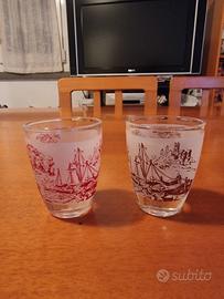 Vendo set completo di 8 bicchierini in vetro decorato, con raffinate scene illustrative stile vintage/toile de jouy in diverse colorazioni.