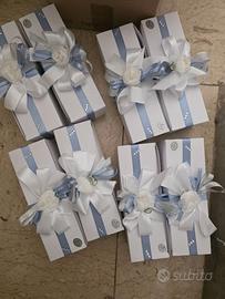 Splendido lotto di 8 clessidre decorative, perfette come bomboniere raffinate per matrimoni, battesimi, comunioni o come eleganti segnaposto. Un oggetto dal design moderno e minimale che simboleggia il valore del tempo. Caratteristiche principali: Materiale: Vetro trasparente di alta qualità con sabbia bianca finissima all'interno. Dettaglio Prezioso: Ogni clessidra presenta un delicato fiocchetto centrale in strass argentati che dona un punto luce molto elegante. Confezione Inclusa: Il set comprende 8 scatole regalo bianche (come da foto), decorate con nastro in raso azzurro polvere, fiocco bianco in seta, rosellina centrale e punti luce. Stile: Moderno / Elegante. Condizioni dell'articolo: Stato: Nuovo, mai utilizzato. Quantità: Il prezzo si riferisce al set completo di 8 pezzi (clessidre + scatole). Perché sceglierle: Sono già confezionate con estrema cura e pronte per essere regalate. La combinazione tra il vetro pulito e i dettagli azzurro/argento le rende adatte sia per maschietto che per eventi neutri.