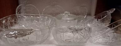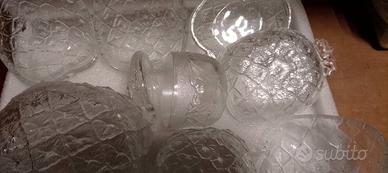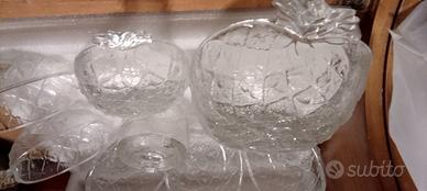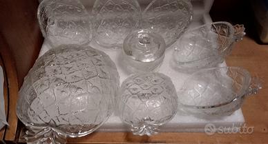 Set di 8 pezzi per macedonia in vetro a forma di ananas : 6 coppette piccole alte 4 cm diametro 11,5, una coppa grossa alta 7 cm diametro 18 cm, zuccheriera alta 8 cm diametro 9. mai usate in ottima condizioni.