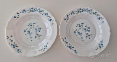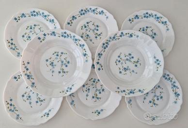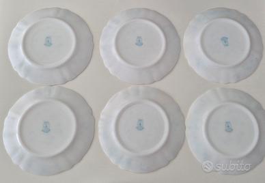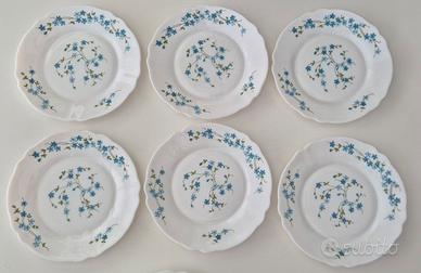 Set 8 piatti in vetro opalino originali Arcopal France serie Veronica Myosotis con il caratteristico decoro a fiorellini azzurri, così composto: - 6 piattini dessert - 2 piatti fondi Tutti in condizioni perfette.