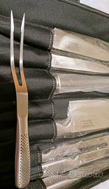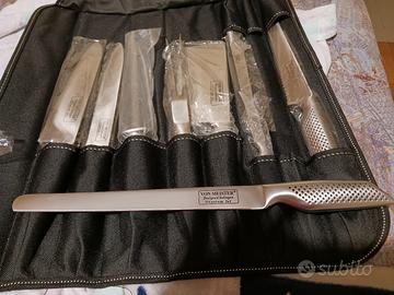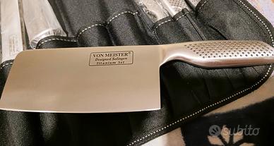 set di 9 coltelli altissima qualità Von Meister originali professionali vendo a metà prezzo con valigetta in tessuto salva qualita'. Sono interamente in TITANIO compreso il manico. Coltelli resistenti,antimacchia e non magnetici. Contiene coltello da: chef, c.per sfilettare, c. da pane,carne,prosciutto, dissossatore, da cucina,affilatore acciaio e forchettone per carne