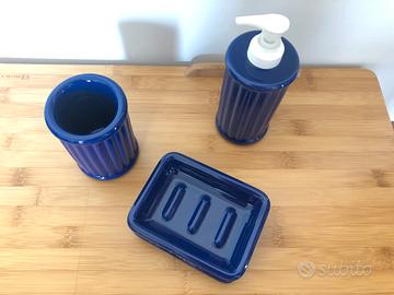 Set accessori appoggio da bagno in ceramica colorata: porta saponette, porta spazzolini, porta sapone liquido. Disponibile in 7 colori (blu, bianco, giallo, rosso, rosa confetto, azzurro, verde). Prezzo 15 euro + 6 euro spese di spedizione.