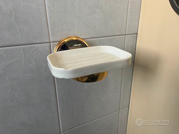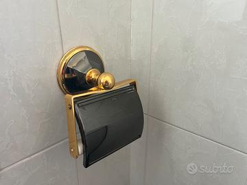 Vendo set completo di accessori per il bagno in stile classico, finitura nero lucido con dettagli dorati, dal design elegante e senza tempo. I pezzi sono in ottime condizioni, ideali per arredare un bagno con gusto e raffinatezza.
