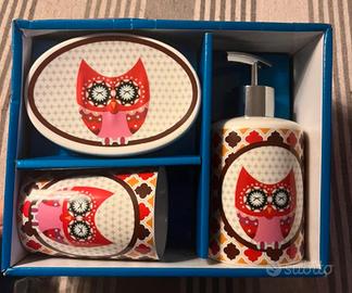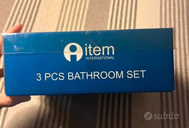 Set bagno in ceramica composto da 3 pezzi (porta saponetta, dispenser sapone liquido, bicchiere). Nuovo mai usato, ancora confezionato.