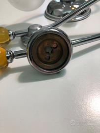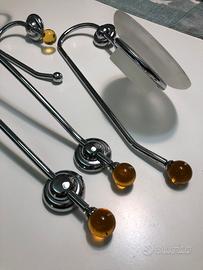 Set di accessori da bagno tutto in ottone,bagno in calvanica cromo lucido.L’articolo si basa su 5 pezzi”asciugamano bagno cm 60 lung.,asciugamano lavabo cm 60 lung.,asciugamano bidet con portasapone cm 34 lung.,portarotolo water cm 18,e appoggio con base per il lavabo di cm 25 e 22 di alt.con portasapone e bicchiere portaspazzolini che manca (rotto),e sfere finali in vetro con colore come foto.Dotato di agganci originali sempre in ottone vendo a euro 35.00visibili per consegna a mano presso capodichino napoli 3927802511