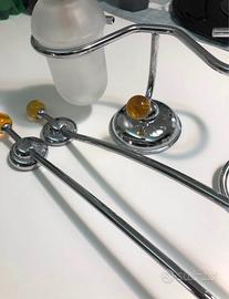 Set di accessori da bagno tutto in ottone,bagno in calvanica cromo lucido.L’articolo si basa su 5 pezzi”asciugamano bagno cm 60 lung.,asciugamano lavabo cm 60 lung.,asciugamano bidet con portasapone cm 34 lung.,portarotolo water cm 18,e appoggio con base per il lavabo di cm 25 e 22 di alt.con portasapone e bicchiere portaspazzolini che manca (rotto),e sfere finali in vetro con colore come foto.Dotato di agganci originali sempre in ottone basta una pulitina con polish e brilleranno come nuovi,vendo a euro 30.00 visibili per consegna a mano presso capodichino napoli 3927802511