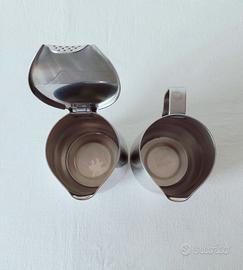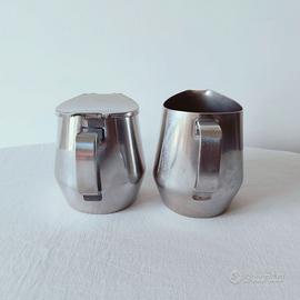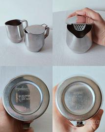 Set di 2 bricchi coordinati della serie "Avio" prodotta da Alessi in Italia negli anni ’70 • Bricco/teiera con coperchio e passino integrato: dotato di beccuccio filtrante, ottimo per tè, infusi, tisane o per trattenere la panna del latte. Altezza 8.5 cm. • Bricco/lattiera senza coperchio: classico bricco da latte o per il cappuccino, ideale per la colazione. Altezza 9 cm. Capacità: 35 cl entrambi Acciaio inox 18/10 Fanno parte della celebre linea di servizio per bar e alberghi disegnata da Carlo Mazzeri e Anselmo Vitale per Alessi. Il progetto originale di questa serie (la famosa serie 103) risale al 1961. Un vero classico del design industriale Made in Italy. Condizioni vintage molto buone, con normali segni d'uso Perfetti sia per un uso quotidiano che come oggetti da collezione per gli amanti del modernariato Vendita in coppia E se vi piace Alessi sul mio profilo ho anche un set di tazze e un mixer! #anni70 #retro #italia #bricco #cremiera #tisaniera #tè #colazione #bar #tavola #tavolo #cucina #servizio #ristorazione #albergo #design #iconici #rari #oggettistica #collezione #collezionisti #collezionismo